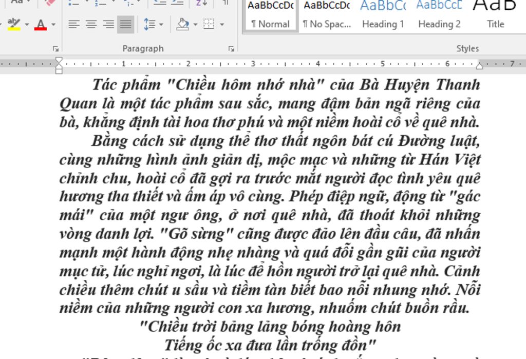 Đúng với tên gọi, bài thơ ''Chiều hôm nhớ nhà'' là một bài thơ đậm ân tình và cảm xúc của tác giả đối với quê hương của bà. Nữ tác giả đã viết bài thơ để bày tỏ nỗi lòng, tâm sự thương nhà nhớ quê. Đồng thời, tác phẩm trên được viết theo thể thơ Đường luật, với niêm, luật chặt chẽ và cách gieo vần cực kì chau chuốt.