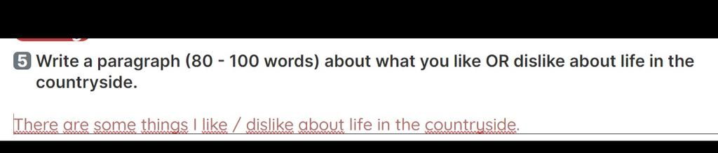 `-` Dislike : I dislike life in the countryside because it is boring, isolated, and inconvenient. I get tired of seeing the same scenery, doing the same activities, and meeting the same people. I feel lonely and disconnected from the rest of the world. I have limited access to education, entertainment, and technology. I have to travel far to get to the nearest town, shop, or hospital. I have to deal with the harsh weather, the pests, and the dirt. Life in the countryside is dull, repetitive, and frustrating. It makes me crave for more excitement and diversity in life .