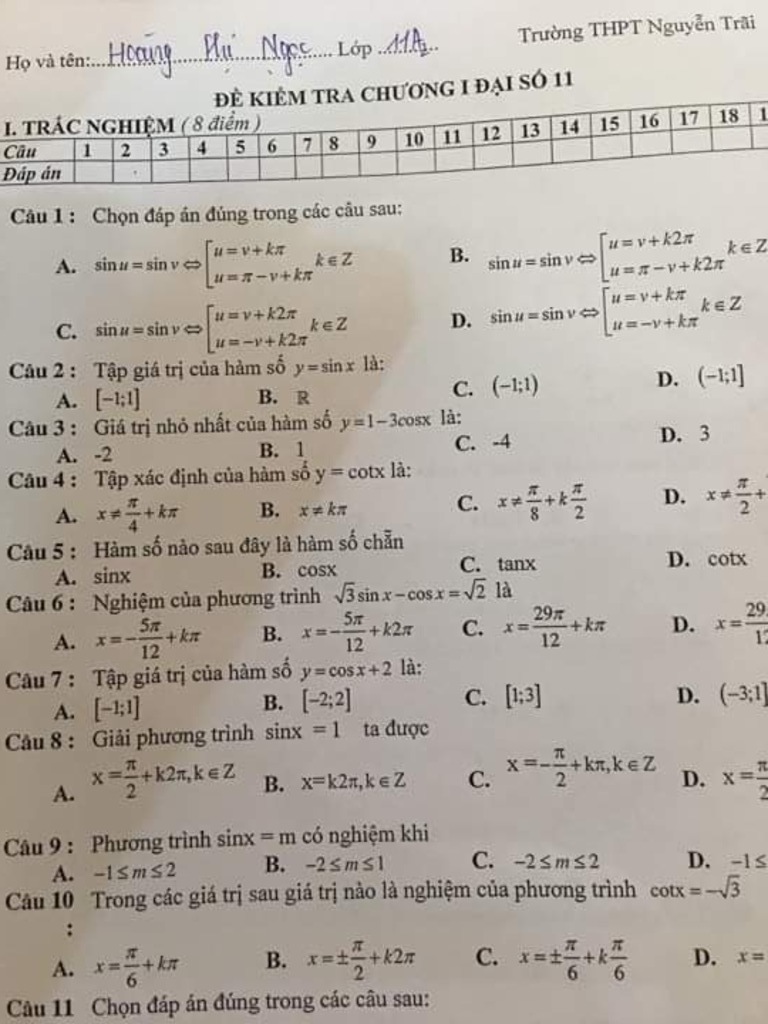 sin u= sin v ⇔ u=v+k2$\pi$ hoặc u=$\pi$-v+k2$\pi$