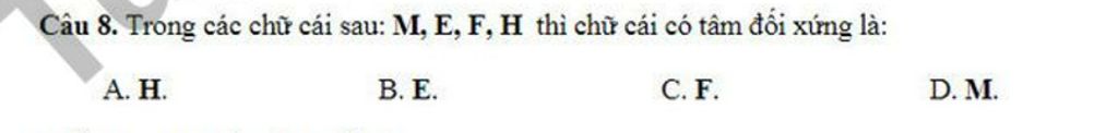 Trong các chữ cái `M;E;F;H` chữ có tâm đối xứng là chữ `H`