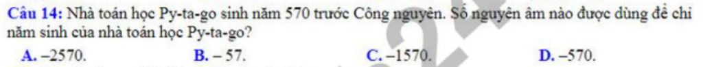 Nhà toán học Py-ta-go sinh năm 570 trước Công nguyên. Số nguyên âm được dùng để chỉ năm sinh của nhà toán học Py-ta-go là : -570