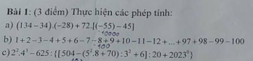 `a)` `( 134 - 34 ) . ( -28 ) + 72 . [ ( -55 ) - 45 ]}`