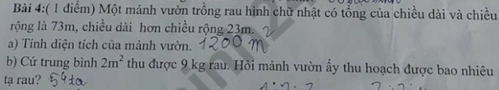 Đáp số `: a. 1200 m^2; b, 54 ` tạ rau