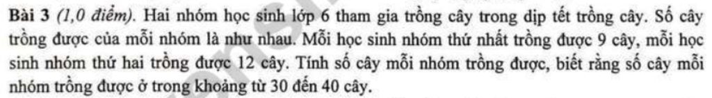 Gọi số cây mỗi nhóm trồng được là `a (a in NN, 30 ≤ a ≤ 40)`