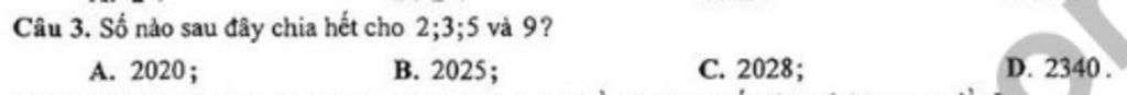Sau khi loại còn lại ba số `2020;2340` ta xét xem số đó có chia hết cho `9` không vì số chia hết cho `9` đều chia hết cho `3`