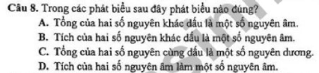 `A.` Sai vì tổng của hai số nguyên khác dấu có thể là số nguyên âm có thể là số nguyên dương.
