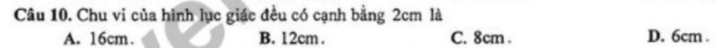 Vậy chu vi của hình lục giác đều là `12cm`.