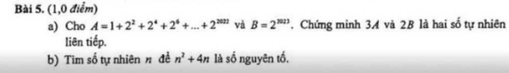 a) Cho A=1+$2^{2}$ + $2^{4}$ + $2^{6}$ +...+$2^{2022}$ và B= $2^{2023}$ Chứng minh 3A và 2B là hai số tự nhiên liên tiếp.