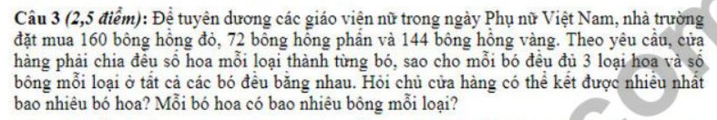 Câu 3 (2,5 điểm): Để tuyên dương các giáo viên nữ trong ngày Phụ nữ Việt Nam, nhà trường đặt mua 160 bông hồng đỏ, 72 bỗng hồng phấn và 144 bông hồng vàng. Theo