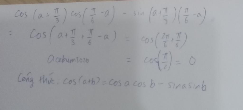 à cos(a+pi/3+pi/6-a) =cos(a-a+pi/3+pi/6) (đoạn này a-a=0) =cos(2pi/6 + pi/6) (quy đồng pi/3 thành 2pi/6 để cùng mẫu pi/6) =cos(3pi/6) =cos(pi/2) (rút gọn) =0 (bấm máy tính, để chế độ radian)