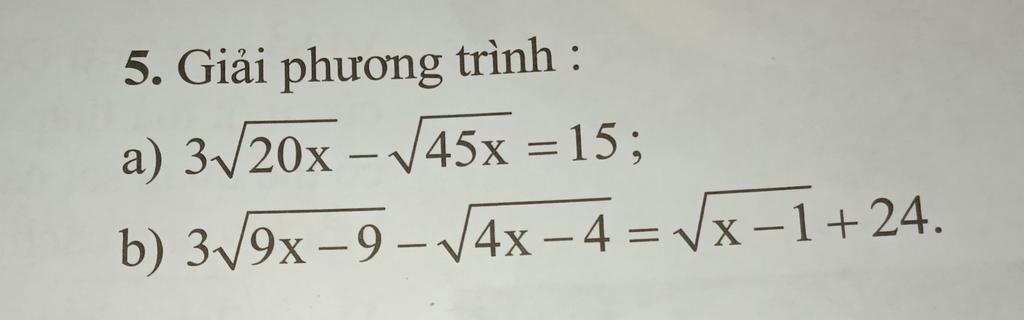 `b)` `3\sqrt{9x-9} - \sqrt{4x-4} = \sqrt{x-1} + 24` `( ĐK : x >= 1 )`