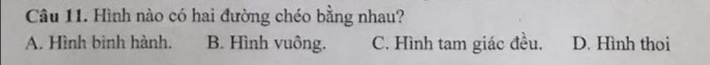 `-` Các hình có đường chéo bằng nhau là `:` Hình chữ nhật và Hình vuông;Hình thang cân