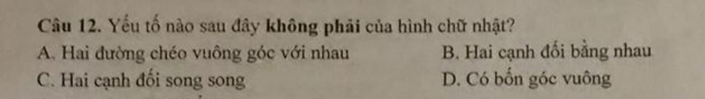 `=>` Yếu tố không phải của hình chữ nhật là: Hai đường chéo vuông góc với nhau