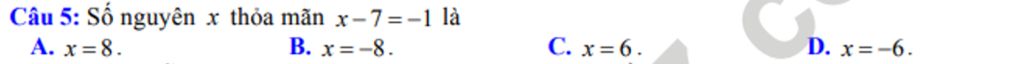 `=>` Số nguyên `x` thỏa mãn `x-7 =-1` là `6`
