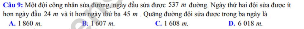 Vậy quãng đường đội sửa được trong ba ngày là `1608m`.