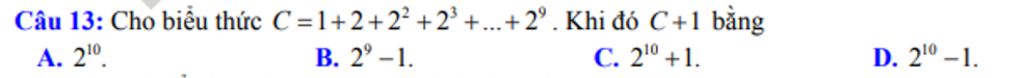 Khi đó `C+1` bằng: `2^10-1+1=2^10`