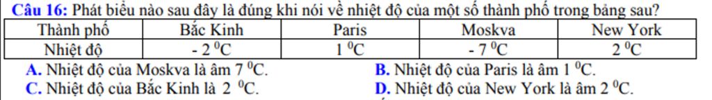 `4)` Nhiệt độ của New York là `-2` độ `C` ( Nhiệt độ của NewYork là `2` độ `C` )