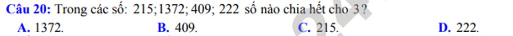 `C. 215 = 2+1+5 = 8 `không chia hết cho `3`