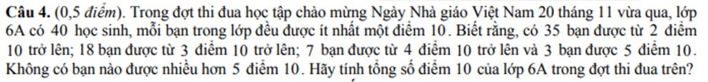 Câu 4. (0,5 điểm). Trong đợt thi đua học tập chào mừng Ngày Nhà giáo Việt Nam 20 tháng 11 vừa qua, lớp 6A có 40 học sinh, mỗi bạn trong lớp đều được ít nhất một điểm 10. Biết rằng, có 35 bạn được từ 2 điểm10 trở lên; 18 bạn được từ 3 điểm 10 trở lên; 7 bạn được từ 4 điểm 10 trở lên và 3 bạn được 5 điểm 10. Không có bạn nào được nhiều hơn 5 điểm 10. Hãy tính tổng số điểm 10 của lớp 6A trong đợt thi đua trên?