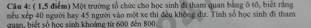 Số học sinh có thể xếp `40` người hoặc `45` người lên `1` xe nên `x` là `BC(40;45)`