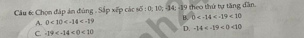 Câu 6: Chọn đáp án đúng . Sắp xếp các số : 0; 10; -14; -19 theo thứ tự tăng dần.