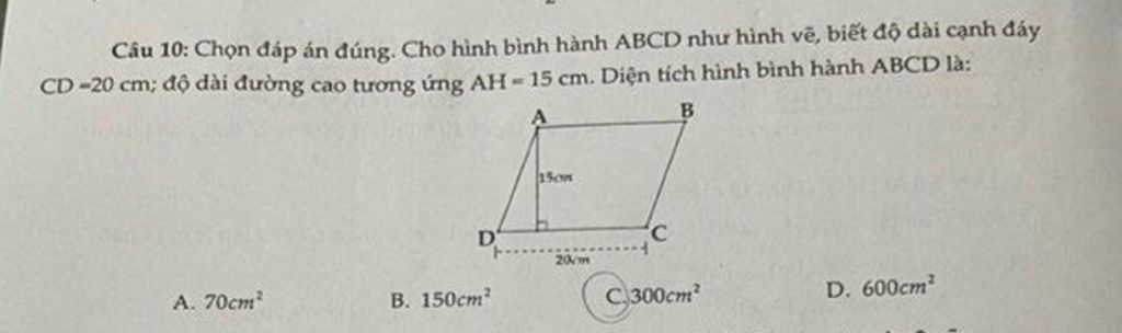 Câu 10: Chọn đáp án đúng. Cho hình bình hành ABCD như hình vẽ, biết độ dài cạnh đáy CD= 20 cm; độ dài đường cao tương ứng AH = 15 cm. Diện tích hình bình hành ABCD là: