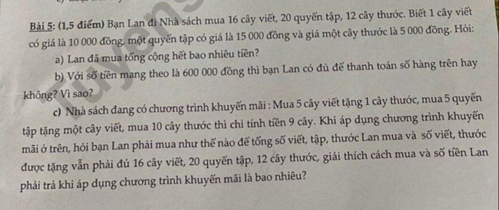 Đáp án:a) Bạn Lan mua hết 520 000 đồng
