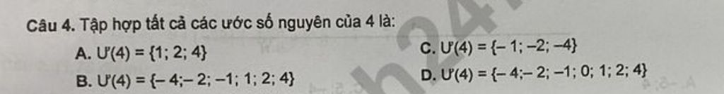 Câu 4. Tập hợp tất cả các ước số nguyên của 4 là: