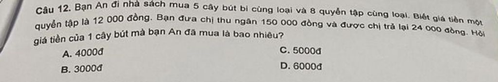 Số tiền bạn An mua `5` cây bút bi là `:`
