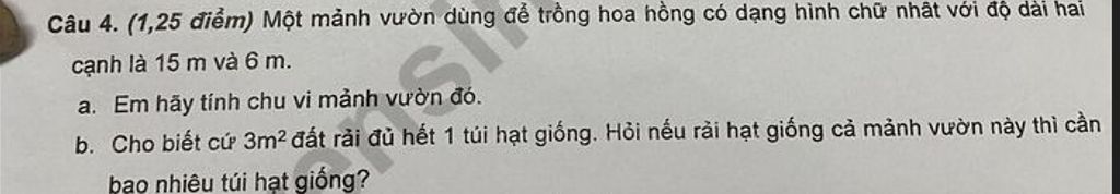 b. Cho biết cứ 3m2 đất rải đủ hết 1 túi hạt giống. Hỏi nếu rải hạt giống cả mảnh vườn này thì cần bao nhiêu túi hạt giống?