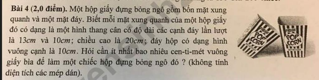 Bài 4 (2,0 điểm). Một hộp giấy đựng bỏng ngô gồm bốn mặt xung quanh và một mặt đáy. Biết mỗi mặt xung quanh của một hộp giấy đó có dạng là một hình thang cân có độ dài các cạnh đáy lần lượt là 13cm và 10cm; chiều cao là 20cm; đáy hộp có dạng hình vuông cạnh là 10cm. Hỏi cần ít nhất bao nhiêu cen-ti-mét vuông giấy bìa để làm một chiếc hộp đựng bỏng ngô đó ? (không tính diện tích các mép dán).