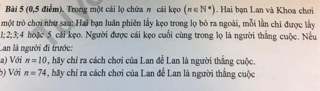 Bài 5 (0,5 điểm). Trong một cái lọ chứa n cái kẹo (n $\in$N*). Hai bạn Lan và Khoa chơi một trò chơi như sau: Hai bạn luân phiên lấy kẹo trong lọ bỏ ra ngoài, mỗi lần chỉ được lấy 1;2;3;4 hoặc 5 cái kẹo. Người được cái kẹo cuối cùng trong lọ là người thắng cuộc. Nếu an là người đi trước: