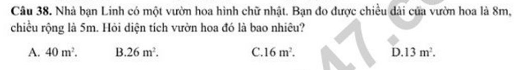 Câu 38. Nhà bạn Linh có một vườn hoa hình chữ nhật. Bạn đo được chiều dài của vườn hoa là 8m, chiều rộng là 5m. Hỏi diện tích vườn hoa đó là bao nhiêu?