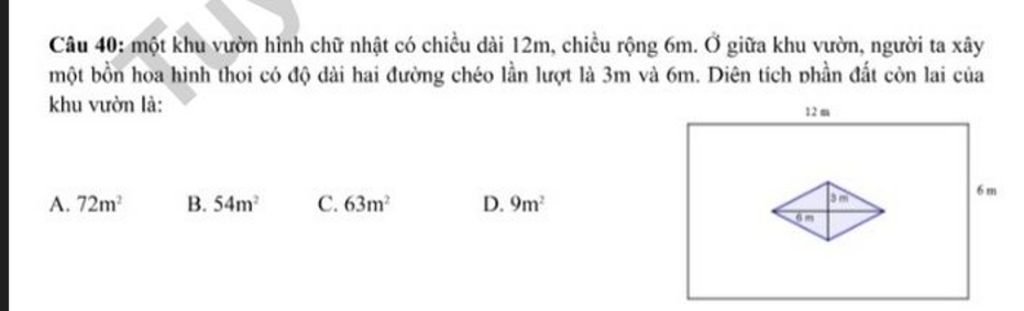 Vậy diện tích phần đất còn lại của khu vườn là `63m^2`.