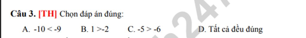 `A.` Đúng vì `10>9` nên `-10<-9`