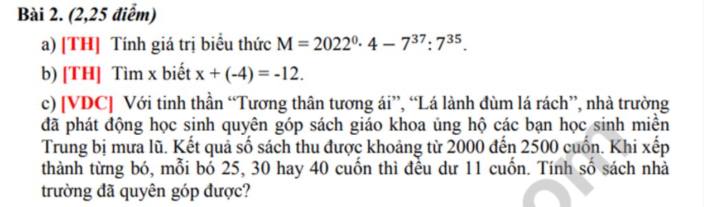 c) [VDC] Với tinh thần “Tương thân tương ái”, “Lá lành đùm lá rách”, nhà trường đã phát động học sinh quyên góp sách giáo khoa ủng hộ các bạn học sinh miền Trung bị mưa lũ. Kết quả số sách thu được khoảng từ 2000 đến 2500 cuốn. Khi xếp thành từng bó, mỗi bó 25, 30 hay 40 cuốn thì đều dư 11 cuốn. Tính số sách nhà trường đã quyên góp được?