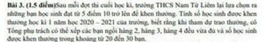 Gọi số học sinh được khen thưởng là `x` (học sinh) `( x in NN, 20 ≤ x ≤30)`