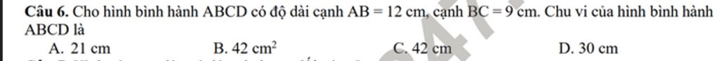 Vậy chu vi hình bình hành `ABCD` là `42cm`.