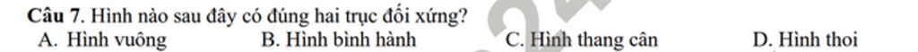 `@` Hình có `2` trục đối xứng là hình vuông `(` Trục ngang và trục dọc `)`