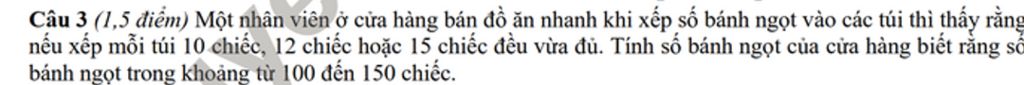 Nếu xếp bánh mỗi tui $10$ chiếc, $12$ chiếc, $15$ chiếc đều vừa đủ