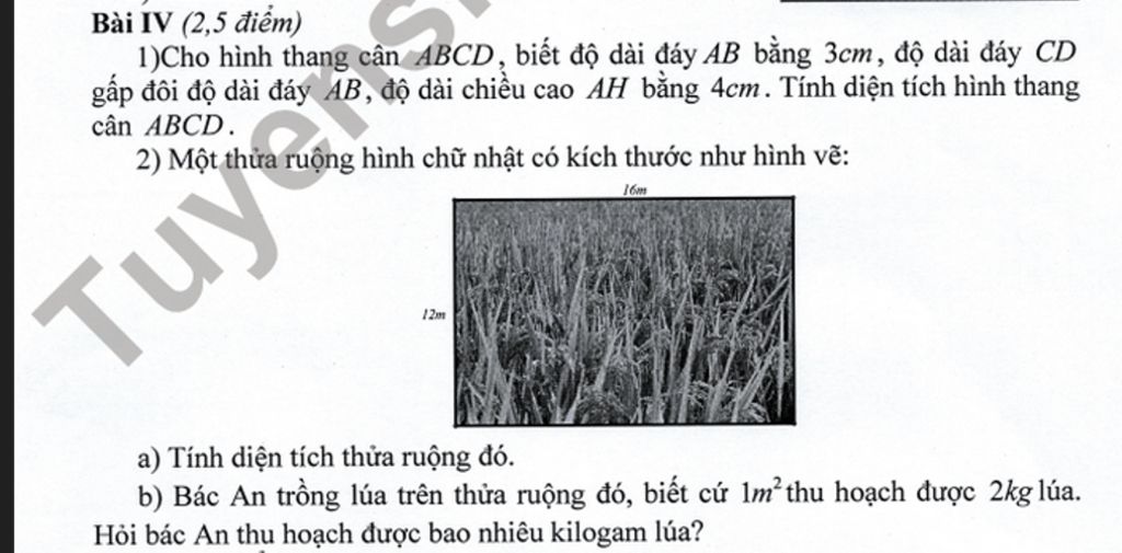 `b)` Bác An thu hoạch được số `kg` lúa là: