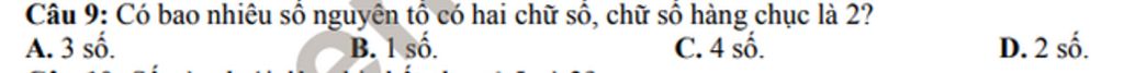 Có `10` số có chữ số hàng chục là `2`, gồm: `20;21;22;23;24;25;26;27;28;29`