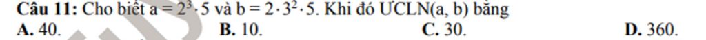 `a = 2^3 . 5 , b = 2 . 3^2 . 5` `=> ƯCLN(a,b) = 5 . 2 = 10` `=>B`