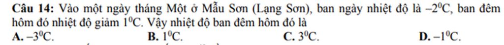 Câu 14: Vào một ngày tháng Một ở Mẫu Sơn (Lạng Sơn), ban ngày nhiệt độ là –20C, ban đêm hôm đó nhiệt độ giảm 1C. Vậy nhiệt độ ban đêm hôm đó là