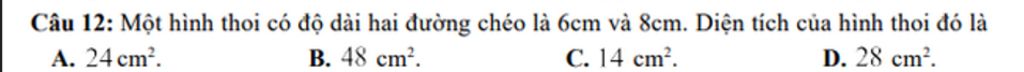 Vậy diện tích của hình thoi đó là `24cm^2`