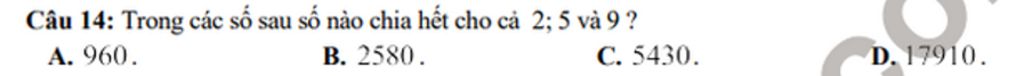 `=>` Số chia hết cho cả `2;5` và `9` là: `17910`