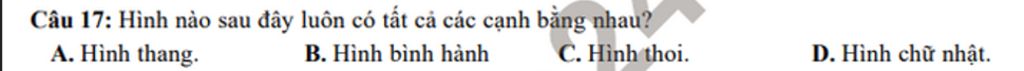 `@` Hình có `4` cạnh bằng nhau tiêu biểu như là `:` Hình vuông `,` hình thoi