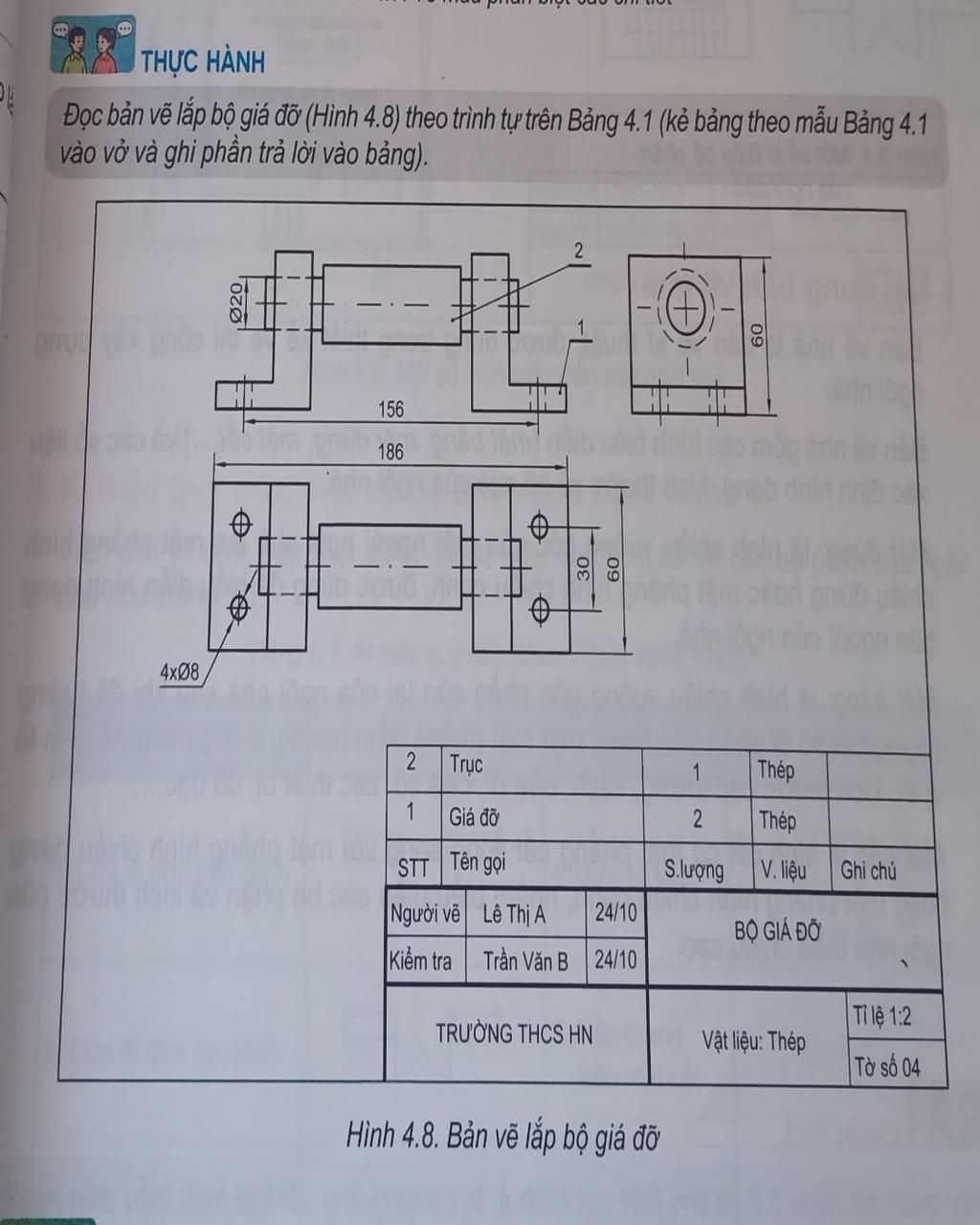 Đọc bản vẽ lắp bộ giá đỡ (Hình 4.8) theo trình tự trên Bảng 4.1 (kẻ bảng theo mẫu Bảng 4.1