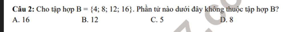 Trong tập hợp `B` chỉ có các phần tử : 4; 8; 12; 16 -> chứ không có phần tử 5 nên chọn C.