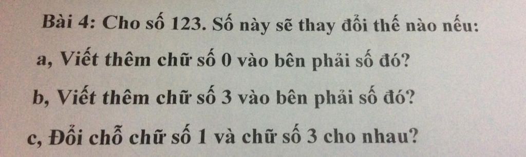b khi viết thêm chữ số 3 vào bên phải số ta có 1233 số 1 đã lên hàng nghìn số 2 lên hàng trăm còn số 3 lên hàng chục và tăng lên 10 lần + 3 đơn vị